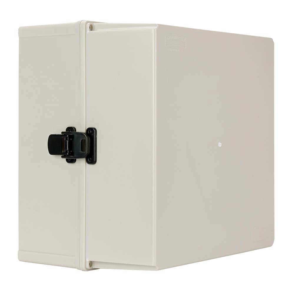 Caixas e quadros são produzidos em material termoplástico de qualidade que confere ao produto excelente acabamento, alta resistência mecânica, a impactos e boa estabilidade dimensional. São diversos modelos e tamanhos com opções de tampas opacas ou transparentes; fechamento por parafusos ou dobradiças e fecho plástico. O sistema de dobradiça é desmontável, o que permite maior mobilidade e facilidade no manuseio durante as montagens. A placa de montagem plástica que acompanha a caixa é removível, permitindo instalações dos equipamentos em bancada e uma maior versatilidade nas disposições dos componentes, além de ser isolante. Modo de fixação em parede, por parafusos, através de local indicado, para manter o grau de proteção especificado. Dimensões: 300mm x 300mm x 210mm Grau de Proteção IP65