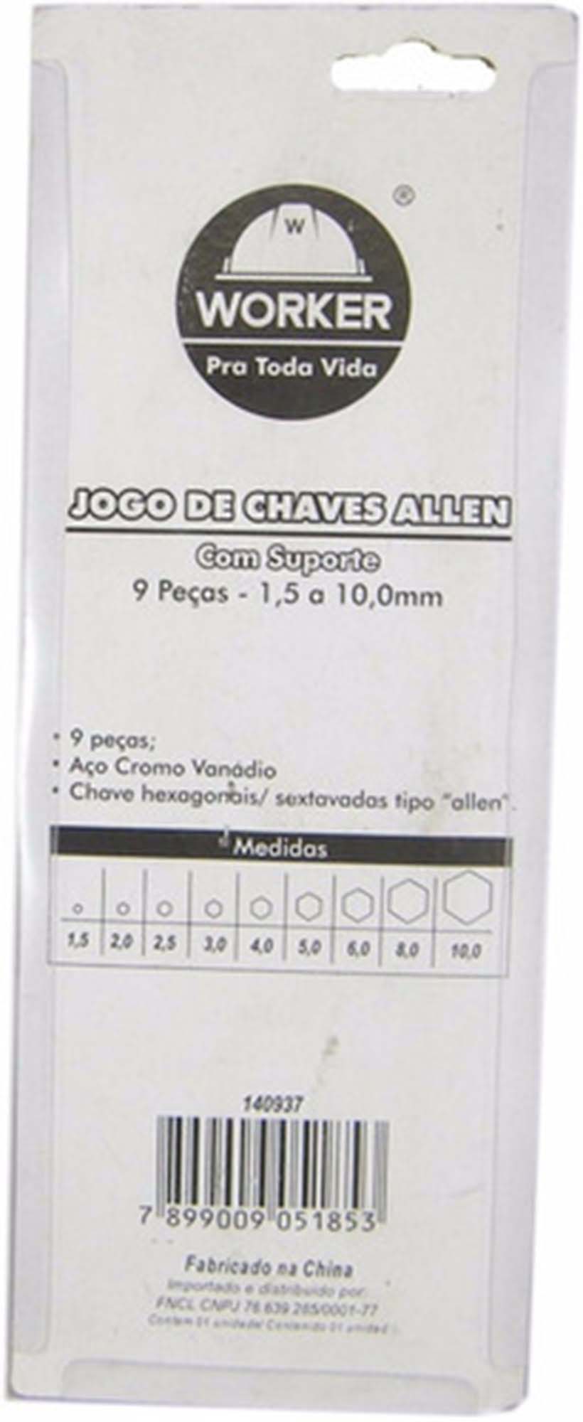 Jogo Kit Chave Allen Longa 1,5 A 10 Com 9 Peças Worker
